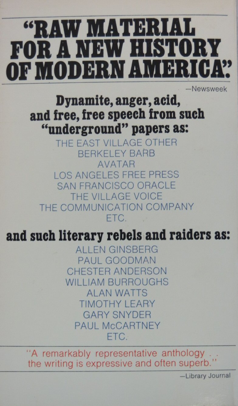 An anthology of essays from underground newspapers pre-1968. Diggers, hippies, mutants, love, Haight Ashbury, the Beatles, & much more. Essays by Burroughs, Ginsberg, Kupferberg, Leary, Watts, Paul Goodman, and McCartney. |
