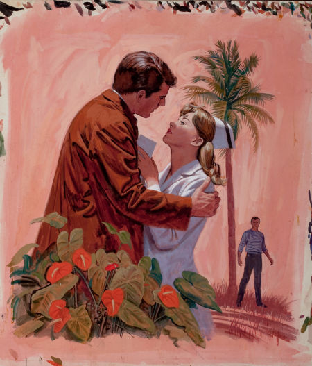 Original cover art by Martin Koeing for Nurse Transplanted. Gouache on board. 19.25" x 16.25." Not signed. Verso has title, ACE Letter-Number series, and artist name. |
