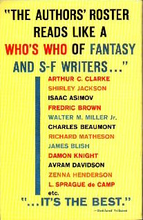 1: (F-105) This collection contains 16 science fiction stories and 4 vignettes. Imagine: A Poem Fredric Brown, You're Another Damon Knight, This Earth of Majesty Arthur C. Clarke, Birds Can't Count Mildred Clingerman, The Golem Avram Davidson, Pottage Zenna Henderson, The Vanishing American Charles Beaumont, Created He Them Alice Eleanor Jones, One Ordinary Day, With Peanuts Shirley Jackson, The Short Ones Raymond E. Banks, The Last Prophet Mildred Clingerman, Botany Bay P.M. Hubbard, A Canticle for Leibowitz Walter M. Miller , Jr., Lament by a Maker L. Sprague de Camp, Pattern for Survival Richard Matheson, The Singing Bell Isaac Asimov, The Last Word Chad Oliver and Charles Beaumont, and 4 vignettes: Too Far Fredric Brown, A Matter of Energy James Blish, Nellthu Anthony Boucher, and Dreamworld Isaac Asimov