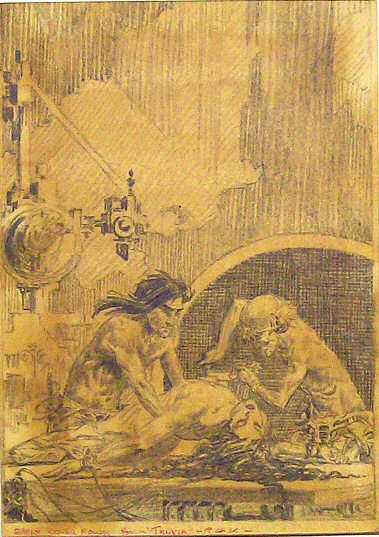 4: (F-181) Original pencil preliminary drawing for The Mastermind of Mars drawn in late 1962. Image area 5" x 7." Notation in pencil in the bottom border area states: "early cover rough for "Thuvia" - RGK." Apparently either Krenkel mis-identified this original when it was sold or he thought it would be used for this title.