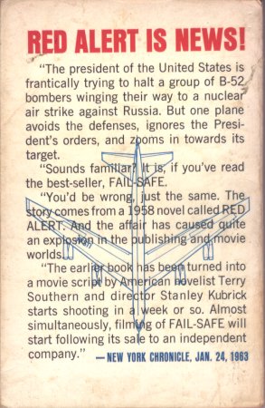 4: (F-210) Peter George (1924-1966) spent most of his career in the Royal Air Force. He wrote two novels. "Two Hours to Doom" (c. 1958, UK) was later titled "Red Alert" for the U.S. market and carries his pseudonym Peter Bryant. Red Alert (1958) is the basis of the 1963 film Dr. Strangelove, Or How I Stopped Worrying and Started to Love the Bomb, directed by Stanley Kubrick. His "Commander -1" (c. 1965, UK) is a further treatment of nuclear warfare. He committed suicide in 1966.