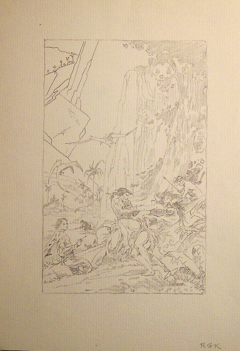 2: (F-156) Roy Gerald Krenkel Jr. (1918-1983) had an early fascination for the works of E. R. Burroughs and the art of J. Allen St. John. A commerical artist who preferred pen and ink, Krenkel's reputation was established by the cover art for ACE Books and DAW illustrating the works of E. R. Burroughs and other fantasy works in that genre. He received the Hugo Award (1963) for Best Artist of the Year, as well as a Heroic Fantasy Award, a special award for his art at the 1982 World Fanasy Convention, and a Bronze Hammer Award (by Robert E. Howard fandom).
