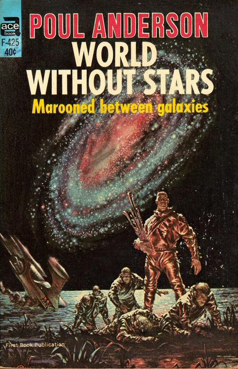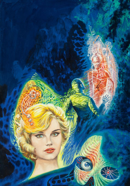 1967 | $0.40 | Kelly Freas | listed as "First Book Publication" Preliminary cover art by Kelly Freas for World Without Stars. Oil on board. 7" x 4.5" (image size). Signed lower left. |