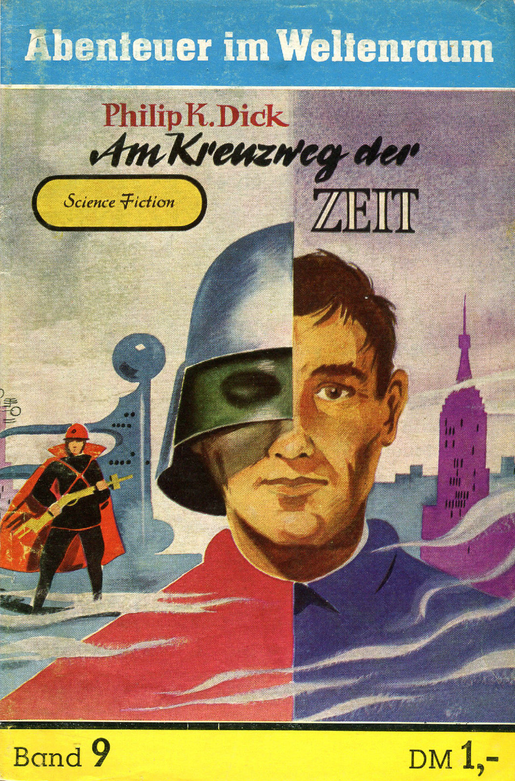 8: (F-391) More use of the same cover art, let's look at the 1958 West German (Hamburg) edition of Andre Norton's The Crossroads of Time (as Am Kreuzweg der Zeit). It was printed as #9 (of 19 volumes) in Alfons Semrau Verlag's Abenteuer im Weltenraum science fiction series. Interestingly, Philip K. Dick is listed as the author, though the novel was written by Andre Norton.