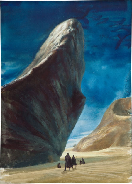 listed as "complete & unabridged" Dune was published by Chilton as a hard cover in 1965. Original cover art by John Schoenherr for Dune. Gouache and watercolor on board. 15.25" x 11." Not signed on art. |