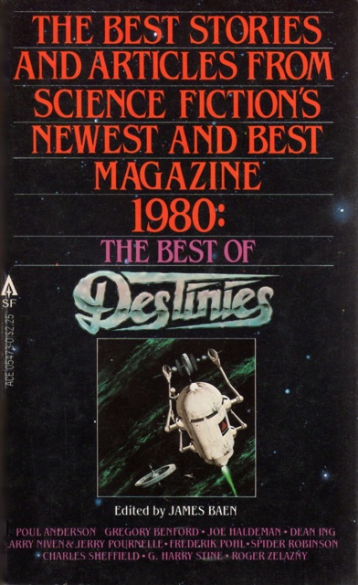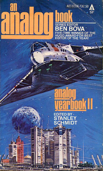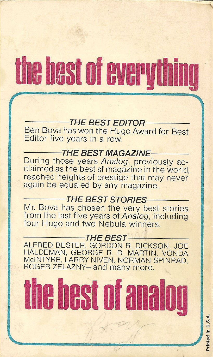 Short story collection from Analog. Introduction ("Taking Off In All Directions) by Bova. Editorial ("The Awe and the Awful") by Gregory Benford. Stories and contributions include: Julian (Kate Wilhelm), Too Soon We Grow Old (Spider Robinson), Guzman's Gardener (Stephen Robinett), More Deadly Than The Male? (Sam Nicholson), Kingsmeat (Orson Scott Card), Oh Say Can You See (Robert Bloch), The Fifties (Barry Malzberg), Immunity to Cancer (Malcolm Thaler), Science Fiction in the Cinema: 1977 (Jeff Rovin) and New Maps of Science Fiction (William Bainbridge and Murray Dalziel). |