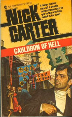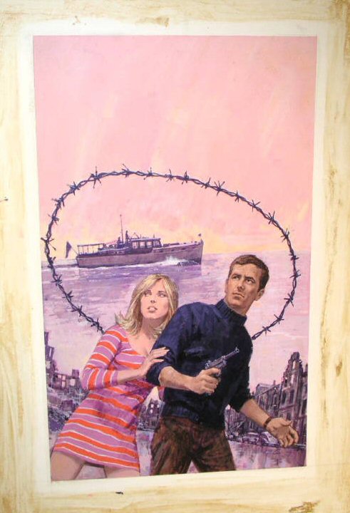 Original cover art by George Gross for Cauldron of Hell. Mixed media on board, 19.5" x 13.25." Title labeled on bottom of board and signature (G. Gross) in lower right of artwork. Michael Jahn appears to be a very prolific author. His pseudonyms include Mike Jahn under which he wrote a lot of TV or movie tie-in books. For instance "The Six Million Dollar Man" series for Berkley, "Switch" for Star and Berkley, "The Invisible Man" for Gold Medal, and "Rockford Files" for Popular Library. His other pseudonym includes Nick Carter - which is the house pseudonym used by author for the ACE series "Nick Carter." |